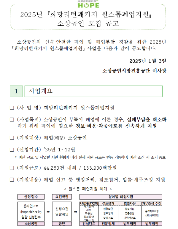 소상공인 폐업지원금, 소상공인 폐업철거지원금의 공식 사업 명칭은, "희망리턴패키지 원스톱 폐업지원"입니다.