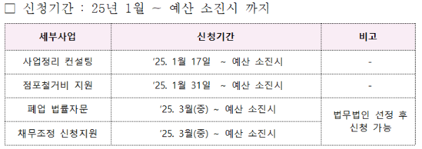 희망리턴패키지 원스톱폐업지원의 신청기간은 2025년 1월부터 12월까지입니다. 단, 예산 소진 시 조기 종료되므로, 필요한 경우 빠르게 신청하는 것이 좋습니다.