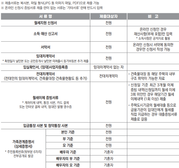 청년 월세 지원 신청을 위해 제출해야 하는 서류는 다음과 같습니다.