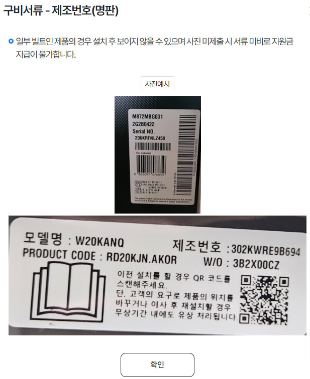 - 제품 전경 사진, 에너지소비효율등급 라벨, 거래내역서(구매내역서), 영수증 등