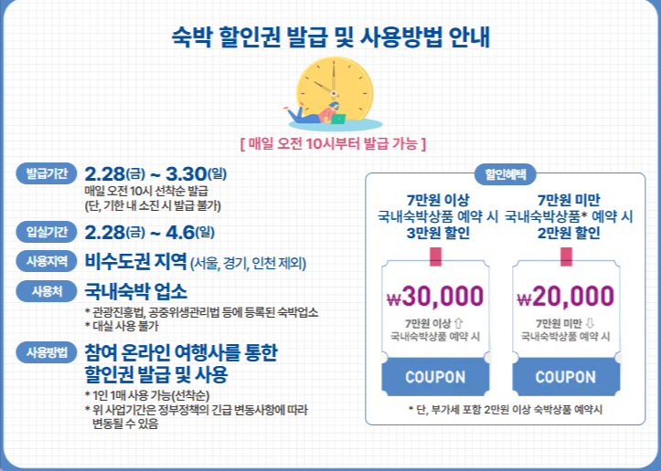 특히, 비수도권 숙박시설에서 사용 가능하므로 지역 관광 활성화에도 기여할 것으로 기대가 되는데요. 할인쿠폰을 어떻게 받을 수 있고, 사용 방법은 무엇인지 자세히 살펴보겠습니다.