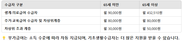 ✅ 부가급여: 생계급여 수급자는 최대 432,510원, 차상위계층은 80,000원
