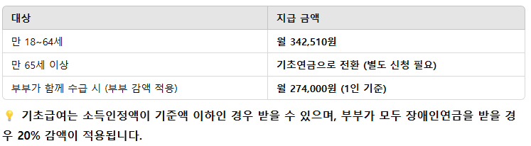 장애인연금은 기초급여와 부가급여로 나누어 지급되는데요. 2025년 장애인연금 지급 금액은 다음과 같습니다.