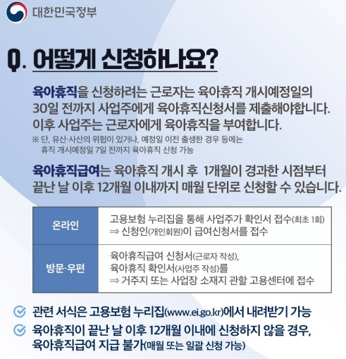 육아휴직 급여는 온라인 또는 오프라인 방식으로 신청할 수 있는데요. 오프라인 신청은 관할 고용센터에 직접 방문하여 필요서류를 제출 후 신청할 수 있으며, 온라인 신청은 고용24 홈페이지를 통해 방문없이 간편하게 진행할 수 있습니다.