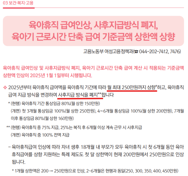 2025년 1월 1일부터 육아휴직 급여가 기존 150만원에서 250만원으로 인상되며, 육아휴직 기간 중 75%만 지급되고 복직 후 6개월 이상 근무 시 나머지 25%를 지급했으나, 올해부터는 100% 즉시 지급되니 지금 바로 신청 해 보시기 바랍니다.